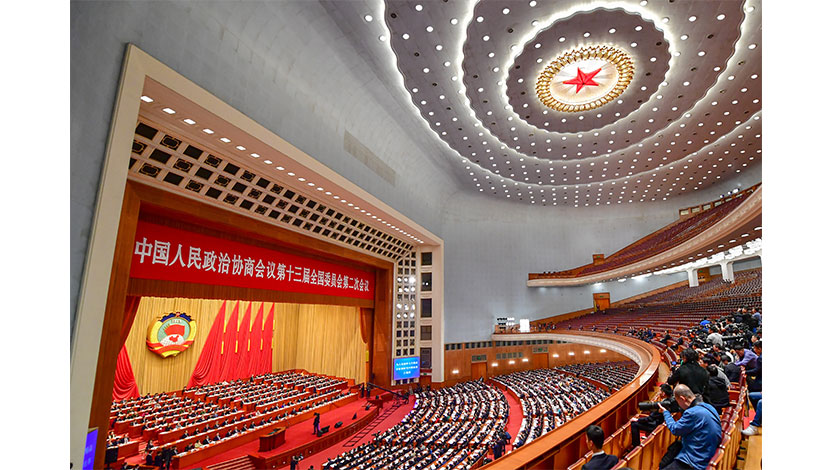 3月10日,全國政協十三屆二次會議在北京人民大會堂舉行第三次全體會議,全國政協主席汪洋出席會議。(中新社圖片/ 杜洋 攝)