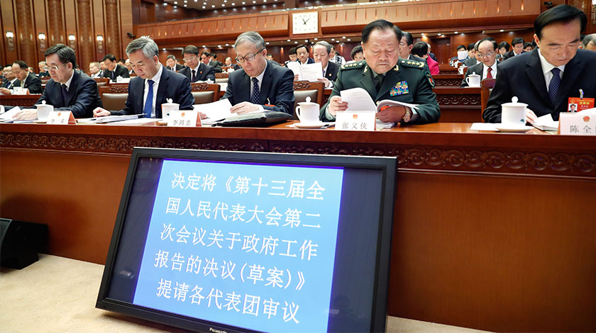 3月12日,十三屆全國人大二次會議主席團在北京人民大會堂舉行第二次會議。(中新社圖片/ 劉震 攝)