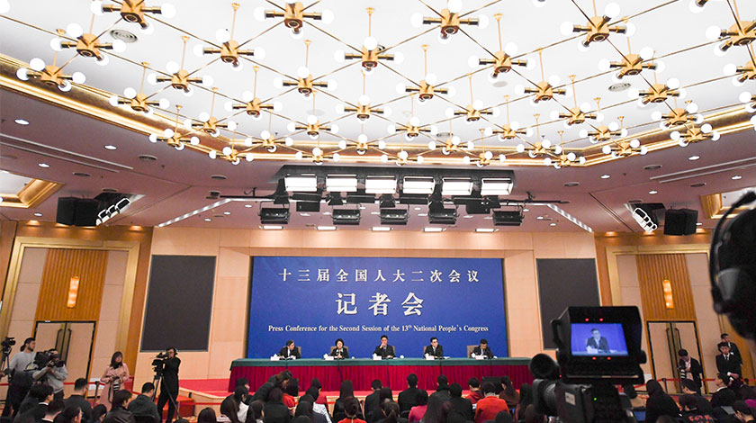 3月12日,十三屆全國人大二次會議新聞中心舉行記者會,邀請最高人民法院審判委員會副部級專職委員劉貴祥、福建省高級人民法院院長吳偕林、江西省高級人民法院院長葛曉燕就『攻堅‘基本解決執行難’』相關問題回答中外記者提問。(中新社圖片/ 張婭子 攝)