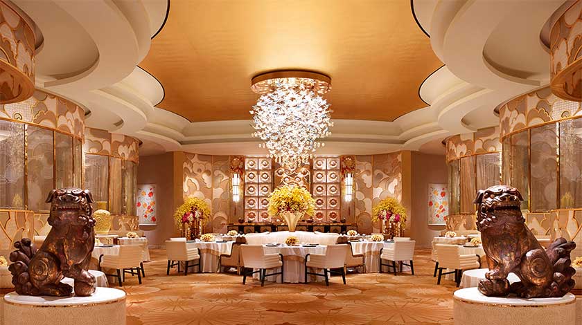 中國茶道融匯中華歷史文化精髓,品茗更蔚為風尚,是餐飲中不可或缺的元素。川江月的茶廊華麗大氣,背壁由玻璃馬賽克磚拼成的花卉圖案組成,璀璨奪目,映襯著前方放於金色蓮花托碟上的珍稀茶餅,所有的細節令人目不睱給。融合中西式建築元素,川江月設計佈局清雅和諧,大廳以優雅的米黃色為主調,中央懸掛了量身定制、由七百多隻義大利穆拉諾玻璃彩蝶組成的吊燈,搭配花藝擺飾,形成花香引蝶喜氣熱鬧的如詩畫面。其獨特的燈光佈置與尊貴雅緻的用餐氛圍,讓賓客享受視覺與味覺兼備的體驗。有關詳情,可致電 (853) 8889 3663永利皇宮餐飲查詢及預訂。