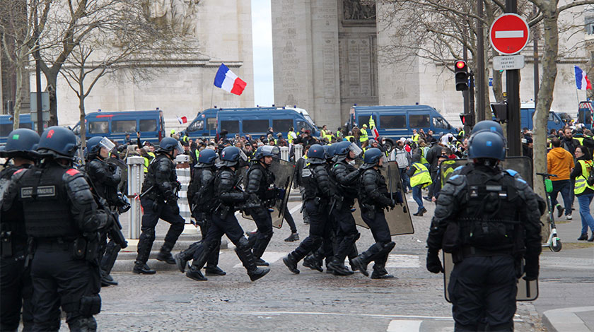 當地時間3月16日,巴黎發生大規模示威。這是巴黎自去年11月以來遭遇的第18輪示威,據法國內政部的統計,有10000人在巴黎參與示威。大批示威者與警方發生衝突,巴黎警方在凱旋門緊張部署應對示威者。(中新社圖片/ 李洋 攝)