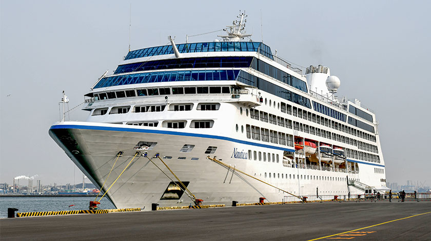 3月18日,馬紹爾群島籍國際豪華郵輪『娜蒂卡(Nautica)』號緩緩靠泊遼寧港口集團大連港國際郵輪中心,成為大連港國際郵輪中心2019年接待的首艘郵輪,這也標誌著大連港2019年郵輪航季正式拉開序幕。圖為國際豪華郵輪『娜蒂卡』號。(中新社圖片/ 趙光輝 攝)