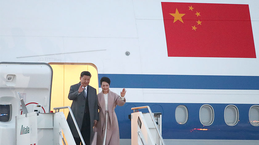 當地時間3月21日,中國國家主席習近平乘專機抵達羅馬,開始對意大利共和國進行國事訪問。圖為習近平和夫人彭麗媛步出艙門。(中新社圖片/ 盛佳鵬 攝)