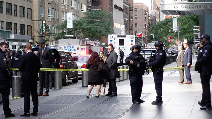 當地時間10月24日上午,美國有線電視新聞網(CNN)位於紐約曼哈頓的辦公大樓收到爆炸裝置包裹,樓內人員被緊急疏散。圖為記者關注事件現場。(中新社圖片/ 廖攀 攝)