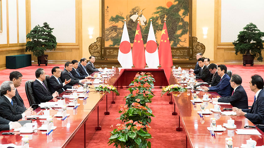 李克強同日本首相安倍晉三舉行會談 10月26日,國務院總理李克強在北京人民大會堂同日本首相安倍晉三舉行會談。(新華社記者黃敬文攝)