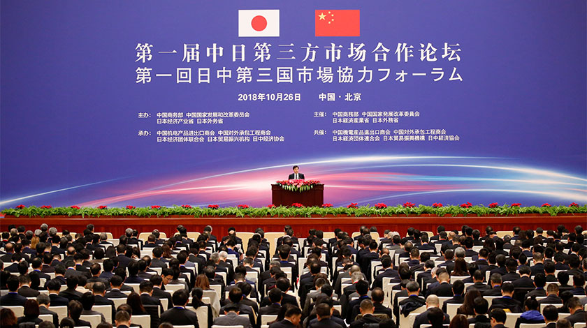 10月26日,由中國商務部、國家發改委與日本經濟產業省、外務省共同主辦的首屆中日第三方市場合作論壇在北京人民大會堂舉行。圖為中國商務部部長鍾山致辭。(中新社圖片/ 李慧思 攝)