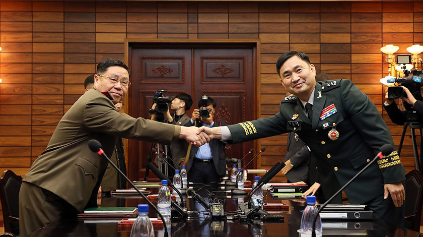 10月26日,韓朝在板門店朝方一側的『統一閣a』舉行第十次將軍級軍事會談,商定將於11月在非軍事區互撤11個警備哨所。(韓國國防部供圖)(中新社圖片/ 鍾新 攝)