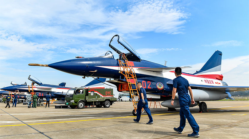 10月31日,中國人民解放軍空軍八一飛行表演隊抵達珠海。中國國際航空航天博覽會將於11月6日—11日在廣東珠海舉行。 (中新社圖片/ 陳驥旻 攝)