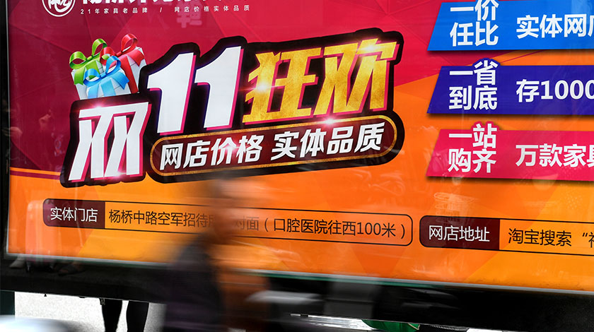 各大電商提前開戰『雙十一』11月1日,福州民眾從一家實體店的『雙十一』廣告牌前經過。『雙十一』臨近,中國各電商網站拉開了促銷的大幕,淘寶、天貓、蘇寧易購、京東等電商網站均已推出各種促銷活動。 (中新社圖片/ 呂明 攝)