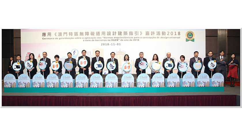 由社會文化司譚俊榮司長領導的康復服務十年規劃跨部門策導小組,昨日下午3時半假澳門旅遊塔會展娛樂中心4樓舉行「應用《澳門特區無障礙通用設計建築指引》嘉許活動2018」 。社會文化司譚俊榮司長、康復服務十年規劃跨部門策導小組組長,中聯辦副秘書長兼社會工作部黃華蓋部長、社會工作局黃艷梅局長、康復服務十年規劃跨部門策導小組副組長,教育暨青年局老柏生局長、體育局潘永權局長、統計暨普查局麥恆珍副局長、衛生局何鈺珊副局長、社會保障基金行政管理委員會袁凱清副主席、高等教育輔助辦公室曾冠雄副主任、民政總署道路渠務部何萬謙部長、法務局法律推廣及公共關係廳羅靜萍廳長、勞工事務局就業廳孟瑞怡廳長、房屋局公共房屋廳陳華強廳長、交通事務局交通規劃及建設廳鄺偉卓廳長及土地工務運輸局公共建築廳陸惠財代廳長主持了啟動儀式。是次嘉許活動邀請了來自各公共部門及社會服務機構代表逾300人出席。