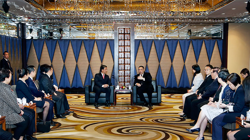 【特訊】行政長官崔世安昨日傍晚在出席澳門科學技術協進會二十華誕晚宴前,與中國科學技術協會常務副主席、書記處第一書記懷進鵬會面,雙方就澳門的科技發展和人才培養等方面進行交流(見圖)。