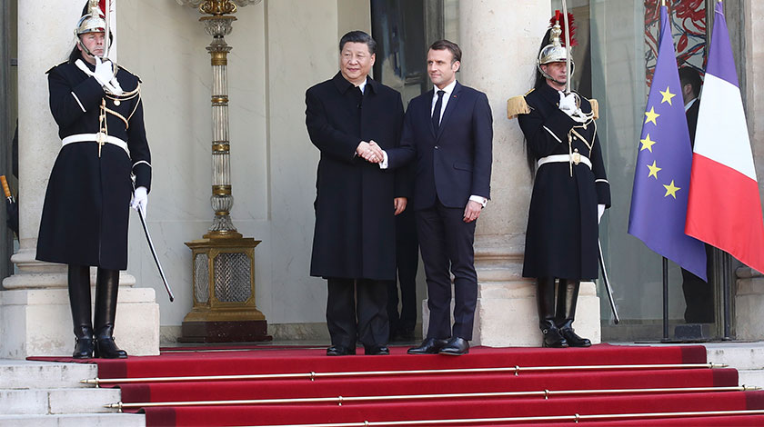 當地時間3月25日,中國國家主席習近平在巴黎愛麗舍宮同法國總統馬克龍會談。 (中新社圖片/ 盛佳鵬 攝)
