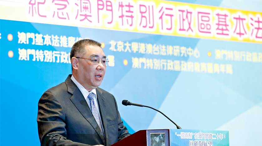 崔世安稱,展望新時代下澳門的發展前景,特區政府必須進一步堅守“一國”之本、善用“兩制”之利,堅持從國家戰略全局和澳門發展大局出發謀劃和開展工作,確保“一國兩制”在澳門的完善,沿著基本法軌道行穩致遠。