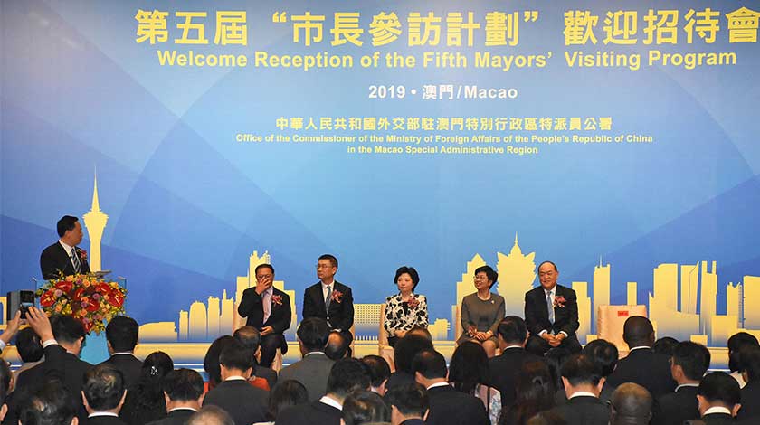 第五屆「市長參訪計劃」歡迎招待會昨假旅遊塔舉行,外交部特派員沈蓓莉、行政法務司司長陳海帆、中聯辦副主任姚堅、立法會主席賀一誠,大灣區九市、成都、常州和秦皇島負責人,以及葡語國家、東盟國家代表等約二百多人出席。