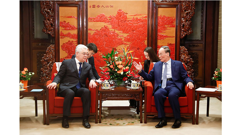 3月29日,中國國家副主席王岐山在北京中南海會見哈薩克斯坦外長阿塔姆庫洛夫。 (中新社圖片/ 盛佳鵬 攝)