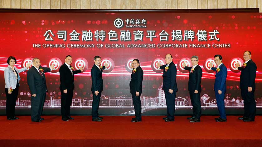 中國銀行「公司金融特色融資平台」揭牌儀式當天在中國銀行澳門分行大廈舉行。中國銀行股份有限公司董事長陳四清,中央政府駐澳門聯絡辦公室副主任張榮順,澳門特區立法會主席賀一誠、經濟財政司司長梁維特等出席。