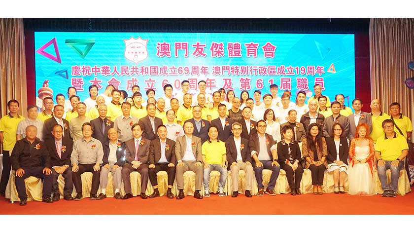 【特訊】澳門友傑體育會為慶祝中華人民共和國成立69周年、澳門特別行政區成立19周年暨該會成立60周年及61屆職員就職典禮,昨(4)晚假萬豪軒酒家舉行,立法會議員施家倫、邱秋雄、高天賜以及嘉賓梁錦釗、珊桃絲、陳忠興等社界好友出席晚宴,場面熱鬧溫馨。